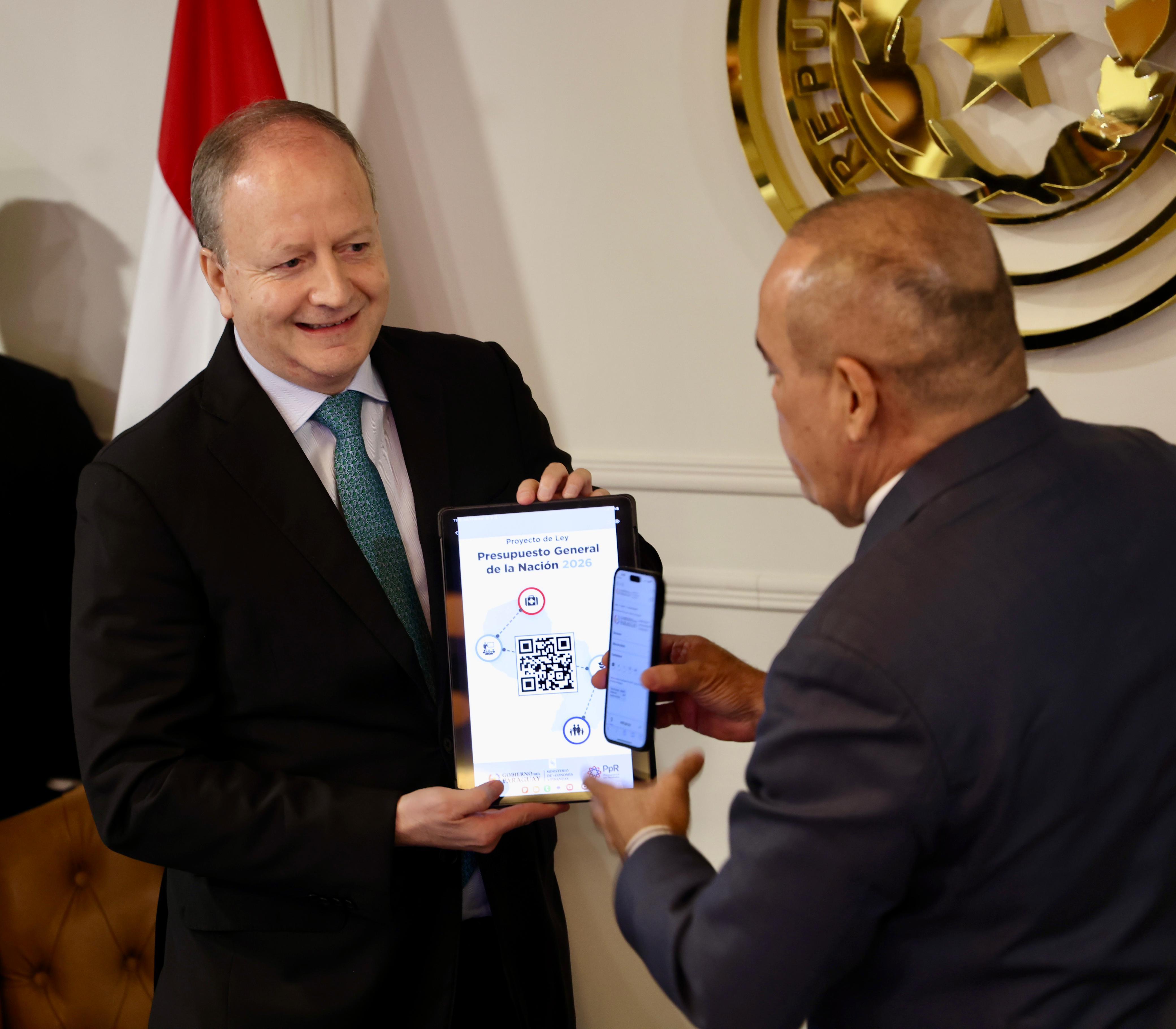 El Ministerio de Economía y Finanza (MEF), presentó el proyecto de Presupuesto General de la Nación (PGN) para el 2026, que asciende a unos USD 18.900 millones. Fernández Valdovinos hizo entrega del código QR, a través del cual toda la ciudadanía puede acceder al proyecto de ley del PGN 2026, presentado ante el Congreso Nacional.