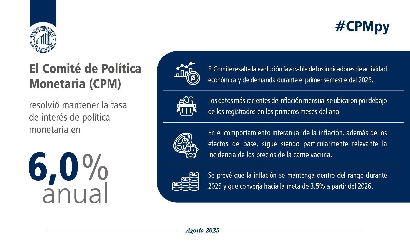 Sebastián Diz, Gerente de Estudios Económicos del Banco Central del Paraguay (BCP), habló hoy con Economía a 1000 sobre la decisión del Comité de Política Monetaria, que por unanimidad, acordó mantener la tasa de interés de política monetaria (TPM) en 6,0 % anual. Recordó que esta tasa puede impulsar o desincentivar tanto el consumo como la inversión, por lo que se considera algo sumamente importante.