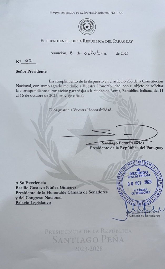 El presidente de la República Santiago Peña, comunicó al Congreso Nacional sobre su viaje a la ciudad de Roma, Italia, del 11 al 16 de octubre del 2025.