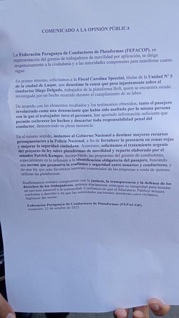 En primer lugar, pidieron que la fiscal de Luque Carolina Spezzini desestime la causa que «pesa injustamente» sobre el conductor Diego Delgado, trabajador de la plataforma Bolt, quien se encuentra siendo investigado por un hecho ocurrido durante el cumplimiento de su labor. Además, se pronunciaron por su colega que recibió cuatro estocadas durante un asalto en Capiatá.