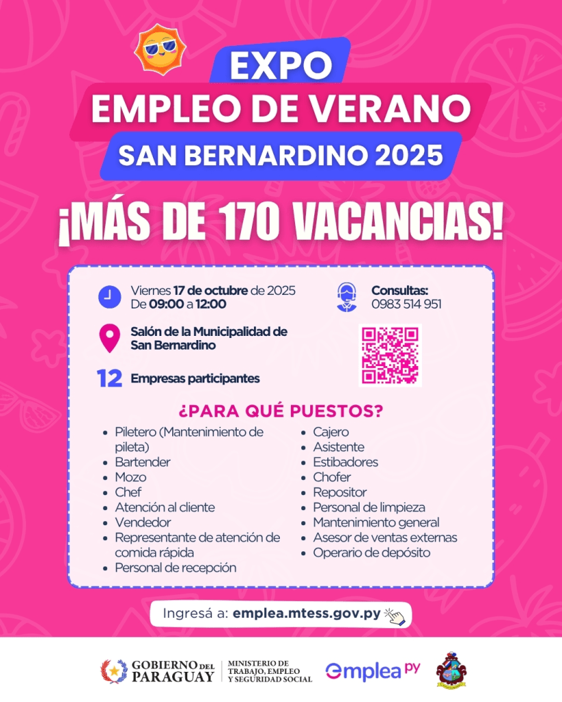 El Ministerio de Trabajo, Empleo y Seguridad Social (MTESS) pondrá en marcha este viernes 17 de octubre el Plan de Empleo de Verano, con la realización de la Expo Empleo de Verano San Bernardino 2025, una jornada que ofrecerá 179 oportunidades laborales en una docena de empresas de distintos rubros.