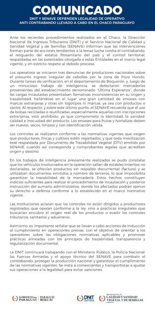 La Dirección Nacional de Ingresos Tributarios (DNIT) y el Servicio Nacional de Calidad y Sanidad Vegetal y de Semillas (Senave), emitieron un comunicado conjunto, en el que defendieron la legalidad del operativo anticontrabando llevado a cabo en el Chaco paraguayo a fin de velar por el resguardo del estatus fitosanitario del país y el control territorial.