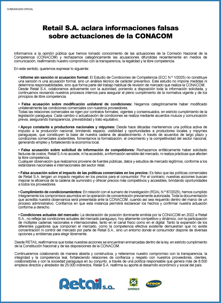 La devolución de la CONACOM sobre este tema se dio ya en Junio de este año, y el señor Mario Goia aseguró que los proveedores que se han opuesto al planteamiento son aquellos que no quieren perder privilegios. En medio de esto, la Comisión de la Competencia ha decidido iniciar un sumario de oficio en base a una revisión anterior a Retail SA, a raíz de la compra de una cadena de supermercados en Caacupé en el 2022.