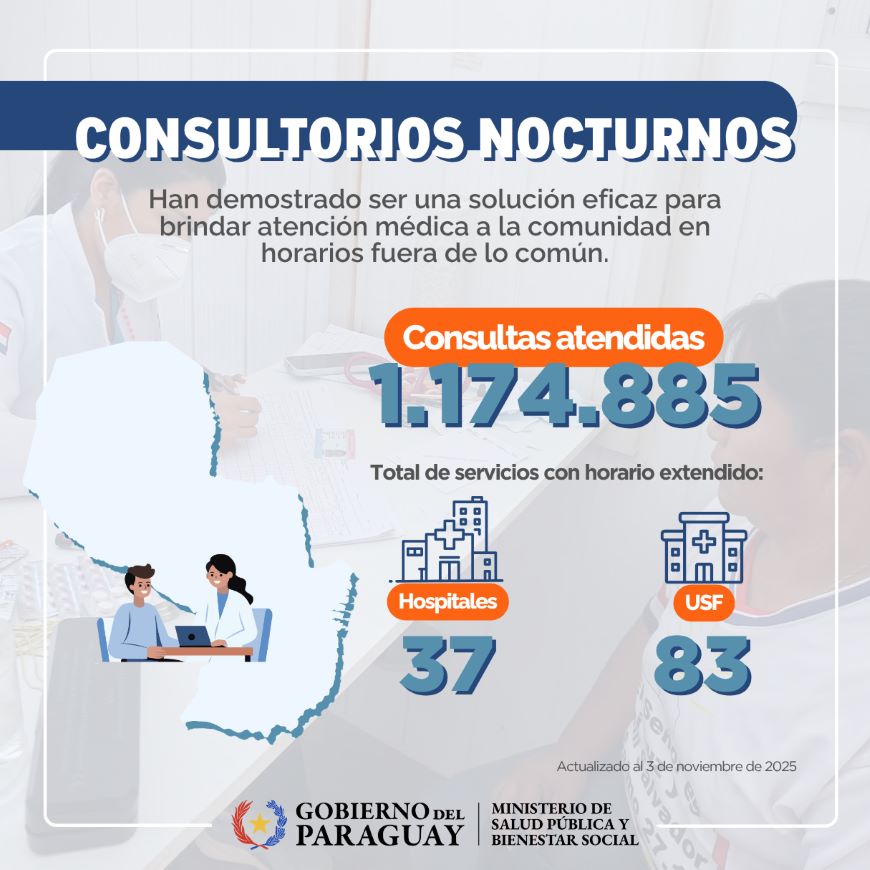 El Ministerio de Salud Pública y Bienestar Social registra un total de 1.174.885 en consultas nocturnas en los distintos establecimientos de salud, en el periodo de enero hasta el mes octubre de 2025.