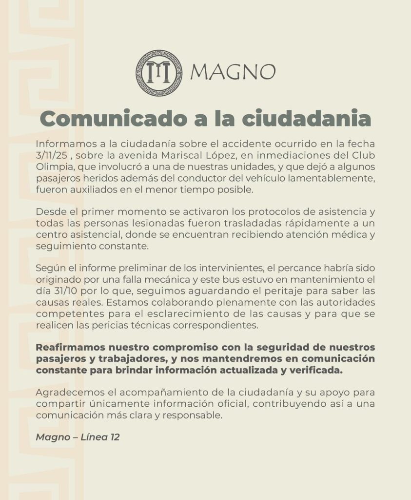 La empresa de transporte Magno-Línea 12, salió al paso de la versión del conductor que chocó contra un árbol sobre la Avenida Mariscal López, Asunción. El chofer había alegado una presunta falla mecánica.