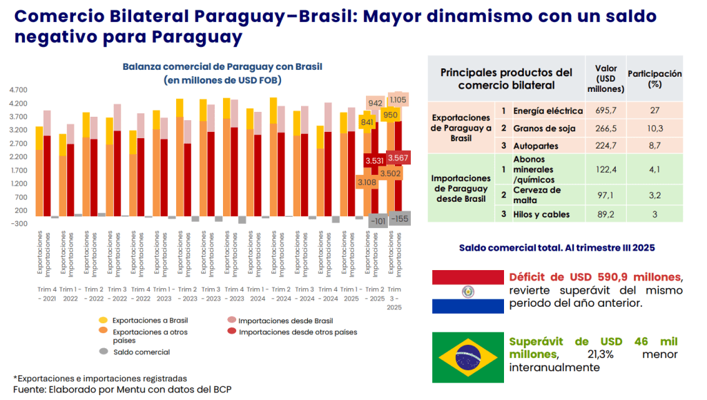 Los datos corresponden al informe “Update Comex Paraguay Brasil”, elaborado por Mentu Asociados para la CCPB, presentado durante un encuentro con periodistas. El material examina la evolución de la relación bilateral hasta el tercer trimestre de 2025, el intercambio comercial registró un notable dinamismo, impulsado por la expansión del sector manufacturero paraguayo y el aumento de la demanda brasileña de productos industriales y alimenticios.