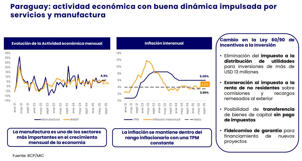 Mientras la economía brasileña modera su crecimiento tras un primer semestre más activo, continúa mostrando solidez, en especial gracias a la reforma fiscal y a las medidas de incentivo al consumo. En tanto, Paraguay mantiene una trayectoria ascendente impulsada por la manufactura, los servicios y la inversión privada.