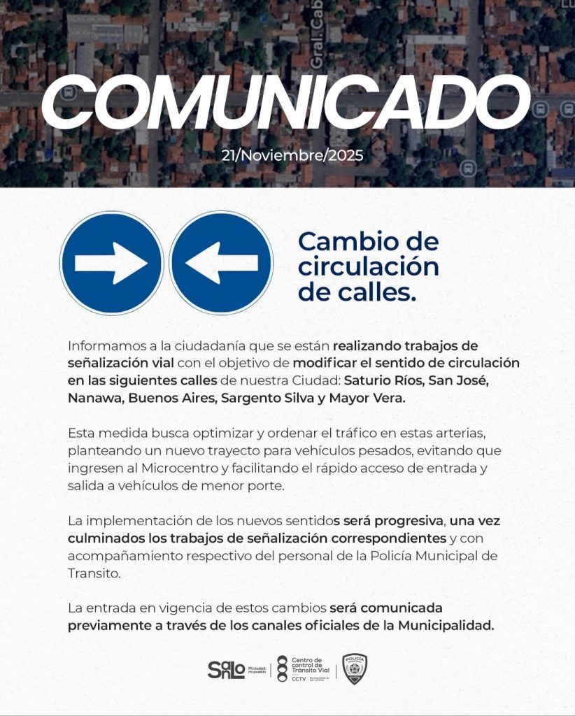 La implementación de los nuevos sentidos será progresiva y se llevará a cabo una vez concluidos los trabajos de señalización, con el acompañamiento del personal de la Policía Municipal de Tránsito. La entrada en vigencia de estos cambios será informada oportunamente a través de los canales oficiales de la Municipalidad.