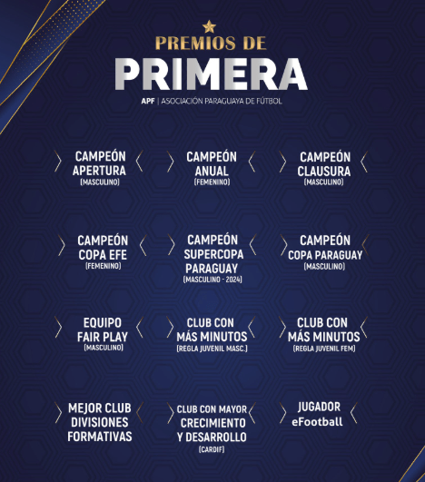 Este miércoles 3 de diciembre, se llevará a cabo una nueva edición de los Premios de Primera, evento que premia a los mejores de la presente temporada del futbol paraguayo, tanto en masculino como en femenino. El evento tendrá lugar en el Pabellón Social del CARDIF, ubicado en el Parque Olímpico del Comité Olímpico Paraguayo.