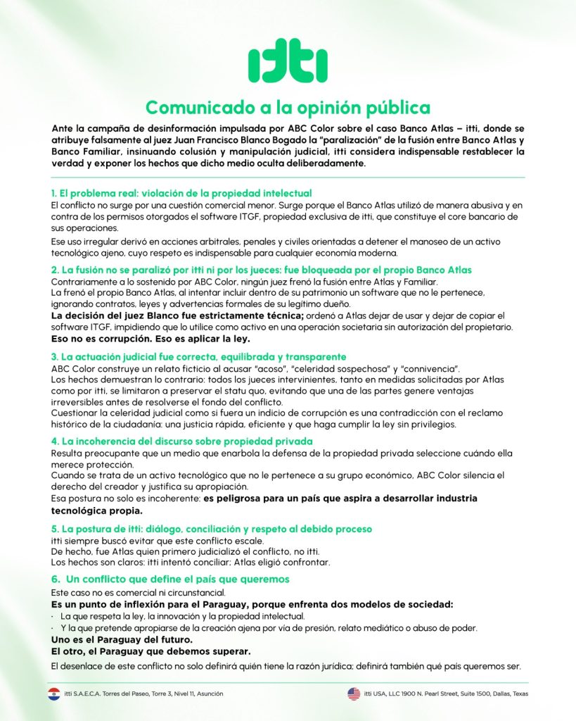 La empresa tecnológica itti emitió un comunicado, mediante el cual subraya que, ABC Color impulsa “una campaña de desinformación” sobre el caso Banco Atlas – itti, donde se atribuye falsamente al juez Juan Francisco Blanco Bogado la «paralización» de la fusión entre Banco Atlas y Banco Familiar, insinuando colusión y manipulación judicial.