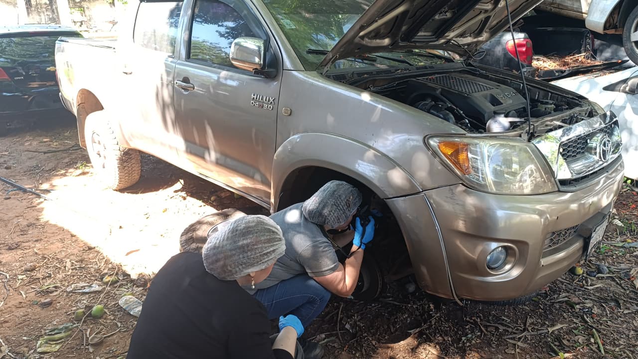 El procedimiento se llevó a cabo en la sede del Departamento de Automotores de la Policía Nacional, donde permanece depositado un vehículo de la marca Toyota, modelo Hilux, que fue incautado tras detectarse irregularidades en el chasis durante un control policial. La diligencia fue acompañada por la asistente fiscal Milba Miranda.