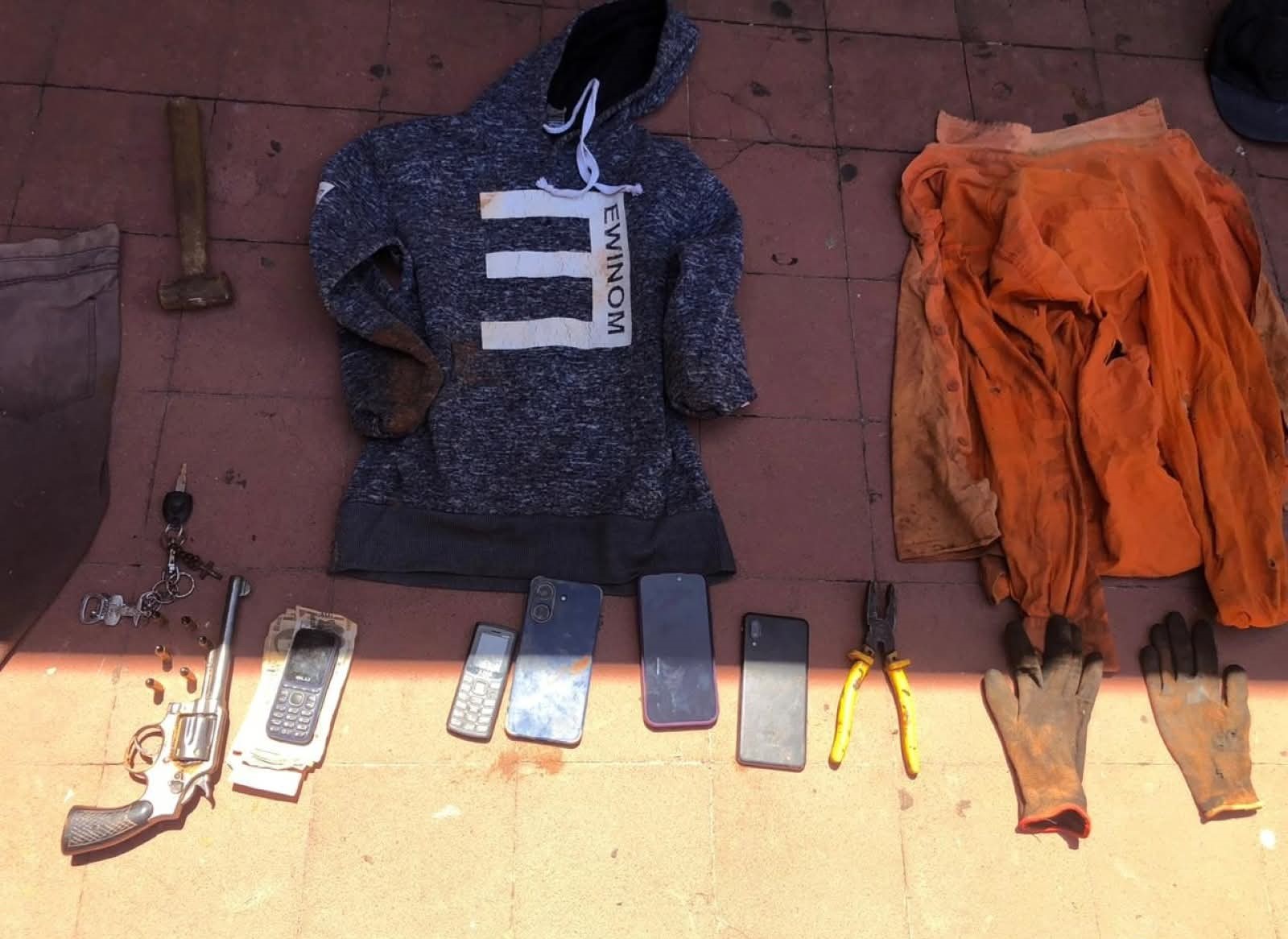 Los dos aprehendidos fueron trasladados a la Comisaría 16ª de Lambaré. Del poder de ambos se incautaron: Un revólver calibre .38, marca Smith & Wesson. Un iPhone dorado. Dos teléfonos Samsung A10. Un celular Blu 110. Un celular Luo 1100. Un pasamontañas azul. Un martillo, una pinza con mango amarillo y prendas personales.