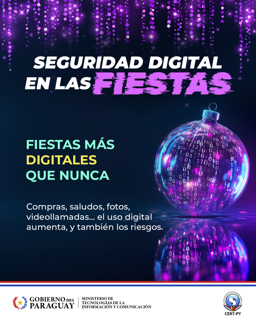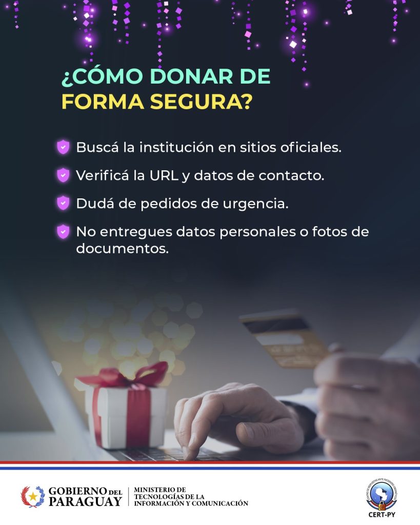 Durante diciembre y enero, el Ministerio de Tecnologías de la Información y Comunicación (MITIC), junto con el Centro de Respuestas a Incidentes Cibernéticos (CERT-PY), desarrollará en sus redes sociales una campaña intensiva de concienciación sobre ciberseguridad, con el objetivo de alertar a la ciudadanía sobre el aumento de delitos en línea que, durante la época festiva, apelan a la solidaridad de las personas.