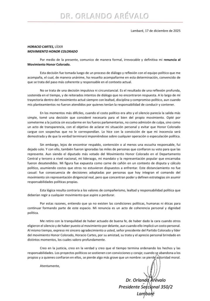 El exdiputado Orlando Arévalo presentó este miércoles su renuncia «formal, irrevocable y definitiva» al movimiento Honor Colorado, en medio del proceso judicial que enfrenta tras ser imputado por el presunto hecho de cohecho pasivo.