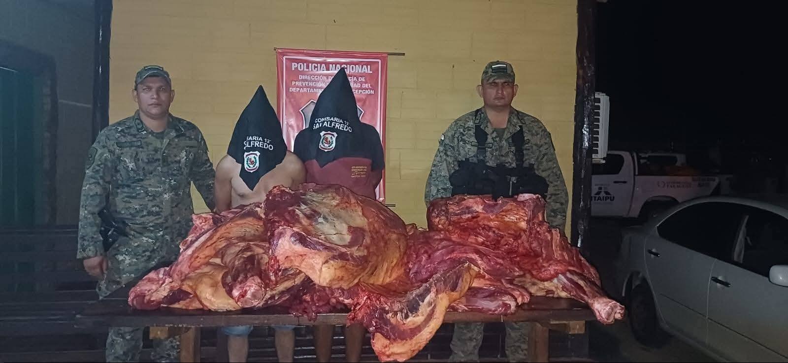 Dos hombres fueron detenidos en la noche del viernes durante un operativo conjunto realizado por efectivos policiales de la Comisaría de San Alfredo y de Paso Horqueta, tras ser sorprendidos transportando una gran cantidad de carne vacuna de presunta procedencia ilícita.
