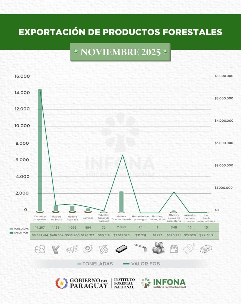 Carbón vegetal y briquetas: continúan liderando las exportaciones forestales del país. En noviembre, alcanzaron 14.287 toneladas por USD 5,64 millones, con incrementos interanuales del 25% en volumen y 24% en valor. Brasil concentró el mayor volumen exportado, mientras que mercados como Estados Unidos y Reino Unido destacaron por su mayor valor FOB.