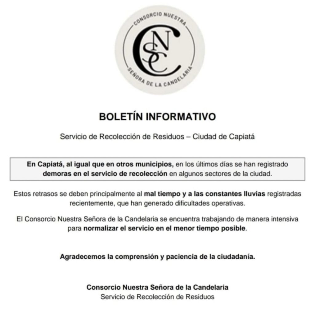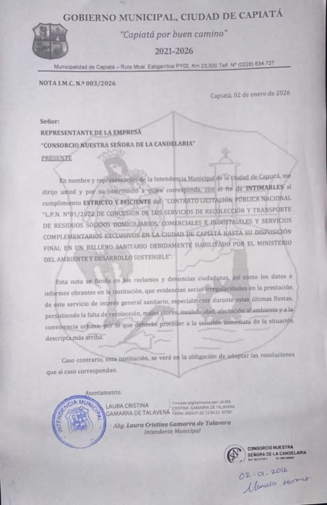 La Intendencia Municipal de Capiatá informó que remitió una intimación formal al Consorcio Nuestra Señora de la Candelaria, en la que exige el cumplimiento estricto del contrato vigente para el servicio de recolección y transporte de residuos.