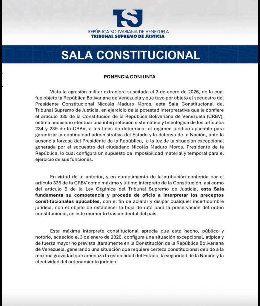 «Se ordena que la ciudadana Delcy Eloína Rodríguez Gómez, vicepresidenta ejecutiva de la República, asuma y ejerza en condición de encargada todas las atribuciones, deberes y facultades inherentes al cargo de presidente de la República Bolivariana de Venezuela, con el fin de garantizar la continuidad administrativa y la defensa integral de la nación», señaló la presidenta de la Sala Constitucional, Tania D´Amelio, al leer un comunicado transmitido de forma obligatoria en radio y televisión. No se precisó fecha de juramentación.