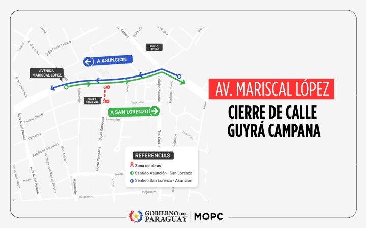 El Ministerio de Obras Públicas y Comunicaciones (MOPC) informó que la calle Guyrá Campana, en la ciudad de Fernando de la Mora, será intervenida para trabajos de mejoramiento, por lo que se aplicarán desvíos en el cruce con la avenida Mariscal López, sin afectar la circulación sobre esta arteria principal.