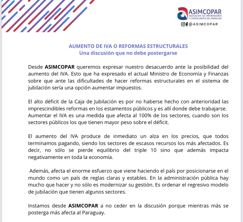 La Asociación de Importadores y Comerciantes del Paraguay (ASIMCOPAR), a través de un comunicado, expresó su desacuerdo ante la posibilidad de un aumento al Valor Agregado, luego de las declaraciones del ministro de Economía Carlos Fernández Valdovinos que apuntaron a las dificultades para avanzar en reformas estructurales del sistema jubilatorio y plantearon como alternativa el incremento de impuestos.