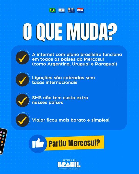 “Sin tarifas sorpresa, sin chip nuevo, sin dolores de cabeza. Viajar ahora es conectar sin pagar extra”, resalta el anuncio oficial del Gobierno de Brasil en redes sociales.