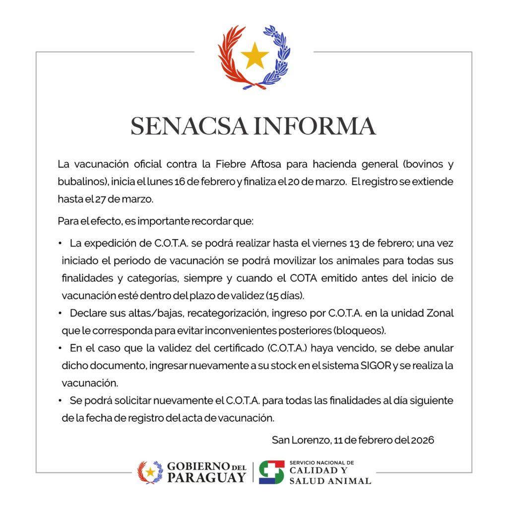 El lunes 16 de febrero comienza el primer período de vacunación contra la fiebre aftosa y la brucelosis en Paraguay, que se extenderá hasta el 20 de marzo, informó el Servicio Nacional de Calidad y Salud Animal (Senacsa). Se espera inmunizar a más de 12,8 millones de bovinos en todo el país, cifra similar a la alcanzada el año pasado.