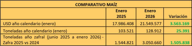 La cosecha de maíz zafra 2025 tuvo un volumen óptimo que, junto a la alta demanda nacional e internacional, permitió duplicar las exportaciones respecto al mismo período de la campaña anterior. Entre junio de 2025 y enero de 2026, Paraguay exportó 3.050.660 toneladas, frente a 1.544.821 toneladas del ciclo anterior, según el informe de Comercio Exterior de la Cámara Paraguaya de Exportadores y Comercializadores de Cereales y Oleaginosas (Capeco).