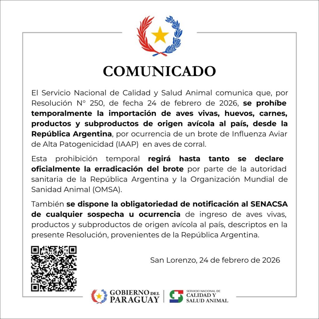 El Servicio Nacional de Calidad y Salud Animal (SENACSA) informó que, mediante la Resolución N.º 250 del 24 de febrero de 2026, dispuso la prohibición temporal de la importación de aves vivas, huevos, carnes, productos y subproductos de origen avícola provenientes de la República Argentina.