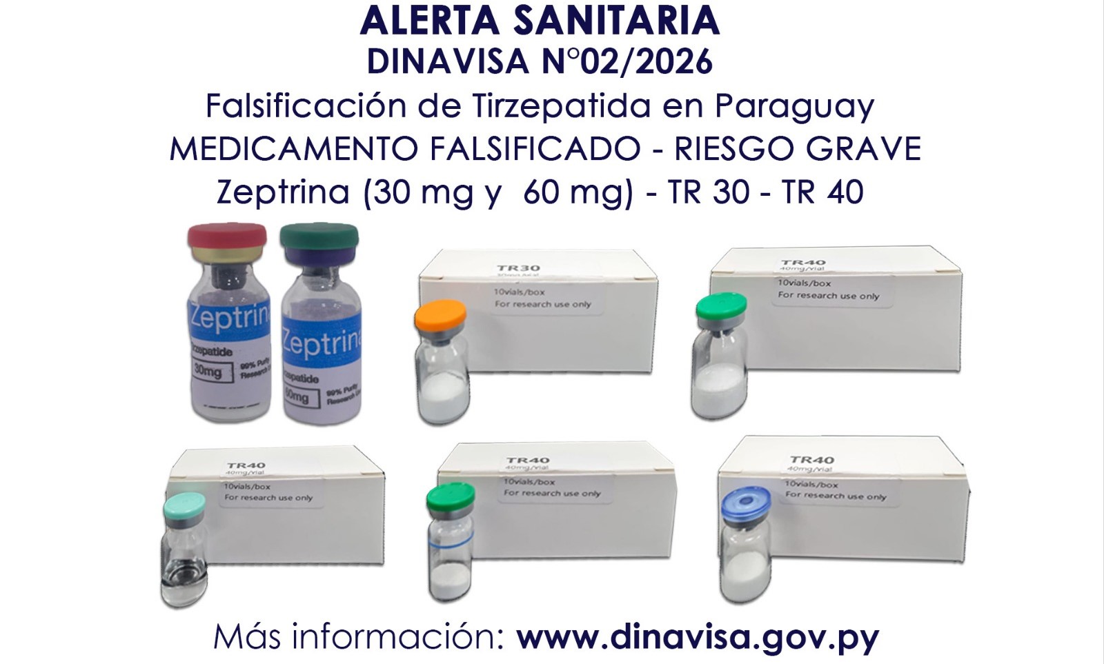 La Dirección Nacional de Vigilancia Sanitaria (Dinavisa), avisó que existe una alerta vigente sobre la circulación de tirzepatida falsificada dentro del territorio nacional. Otras marcas están en proceso de investigación y se presume que una dosis es fraccionada para hacer rendir. Reportaron que estos productos