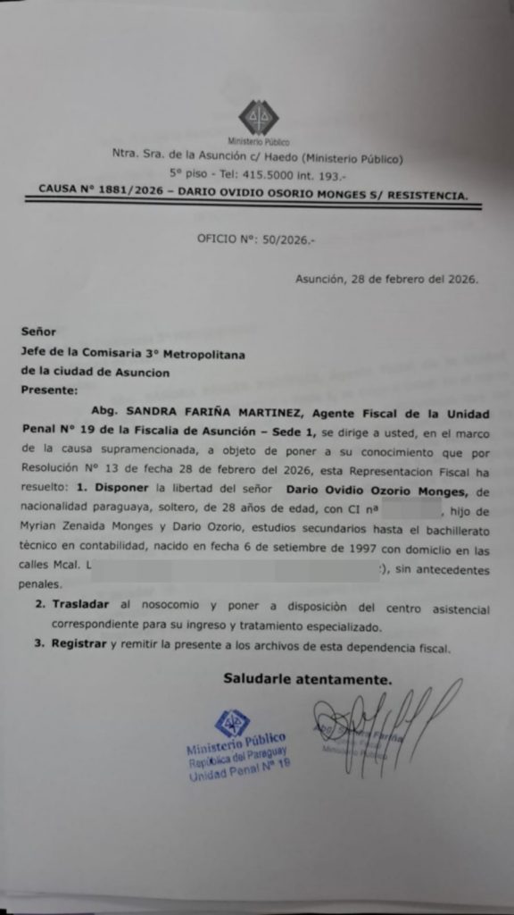 La agente fiscal Sandra Fariña Martínez, de la Unidad Penal N° 19 Asunción, dispuso la libertad de Darío Ovidio Ozorio Monges, el hombre de 28 años que fue detenido tras intentar entrar a un sanatorio donde se encuentra internado el exmandatario Horacio Cartes. Así también ordenó su traslado al Hospital Neuropsiquátrico para una evaluación y tratamiento especializado.