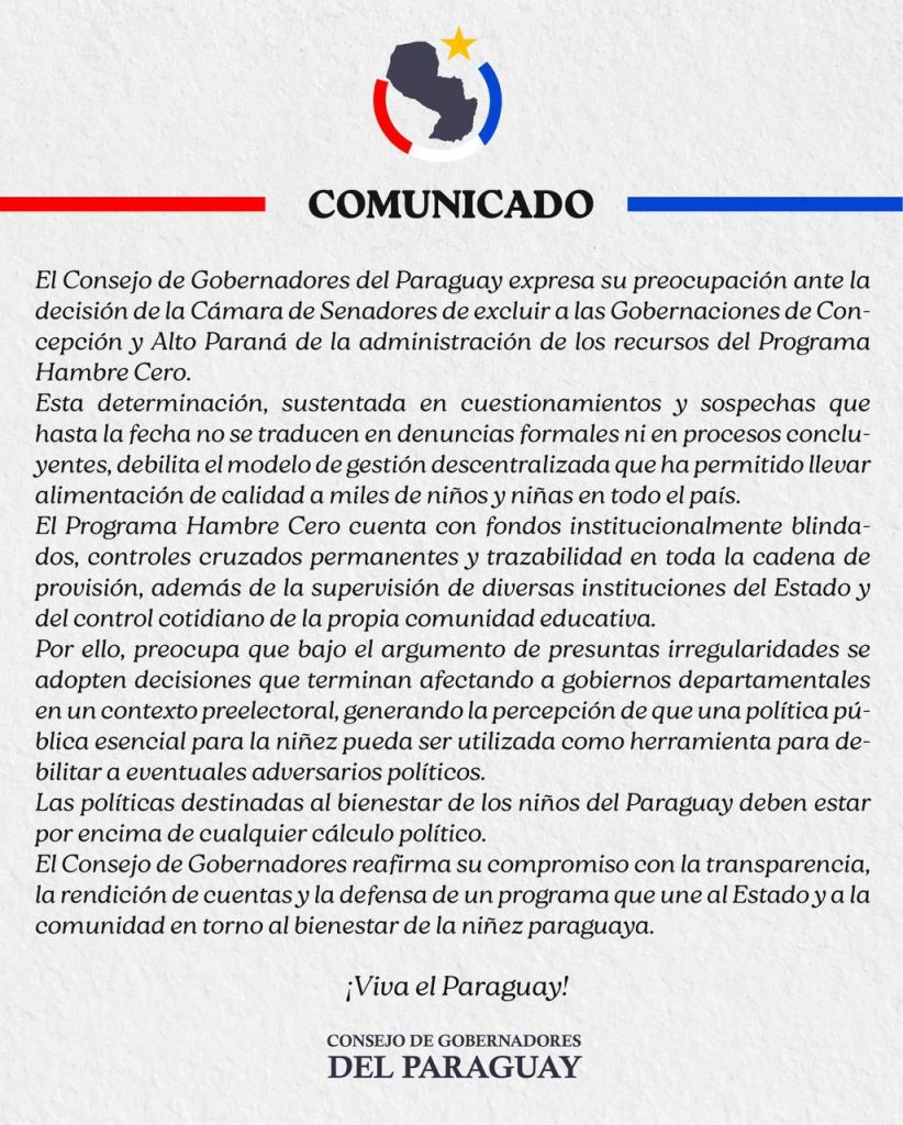 El Consejo de Gobernadores del Paraguay emitió un comunicado en el que expresa su preocupación ante la decisión de la Cámara de Senadores relacionada con la administración de los recursos del Programa Hambre Cero.