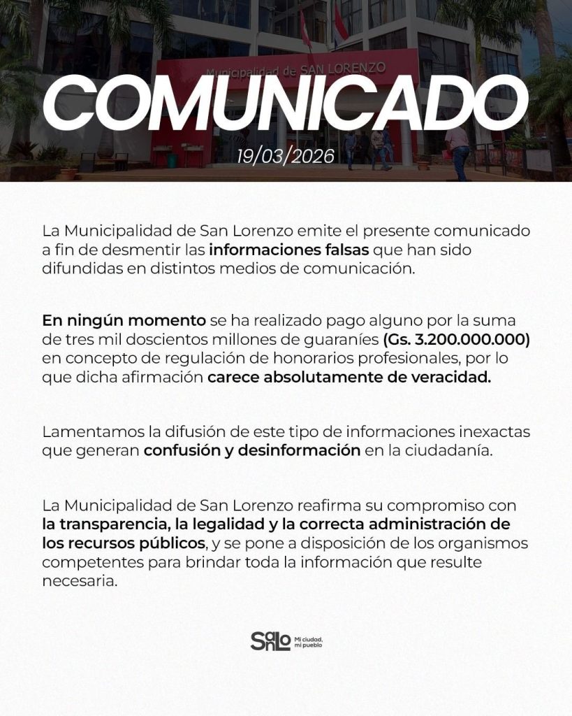 Por su parte, la Municipalidad de San Lorenzo rechazó categóricamente las acusaciones mediante un comunicado institucional. La administración aseguró que las informaciones difundidas son falsas y negó que se haya realizado un desembolso por G. 3.200 millones, como se menciona en algunas versiones.