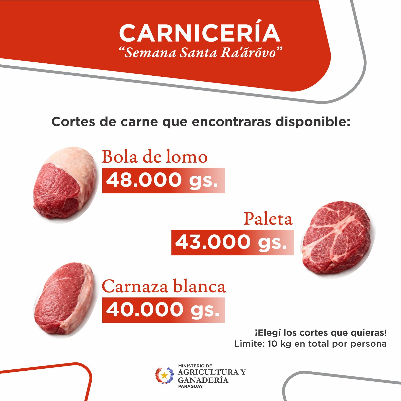 En el marco del operativo «Semana Santa Ra’arõvo 2026», el Ministerio de Agricultura y Ganadería (MAG) informó que dispondrá de unos 20.000 kilos de carne vacuna a precios accesibles durante la feria programada para el Martes Santo en la Costanera de Asunción.
