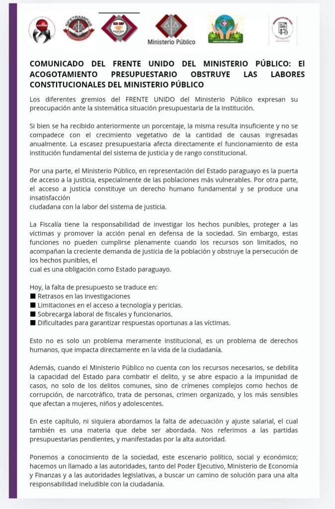 Finalmente, el Frente Unido hizo un llamado a las autoridades del Poder Ejecutivo, al Ministerio de Economía y Finanzas y al Poder Legislativo para buscar soluciones que permitan fortalecer al Ministerio Público y garantizar el cumplimiento de sus responsabilidades con la ciudadanía.