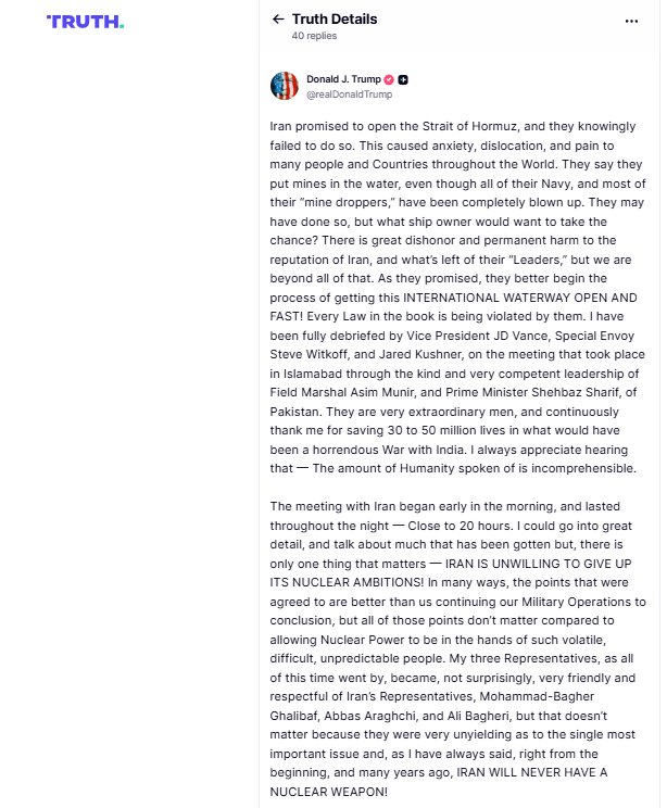 El mensaje completo del mandatario estadounidense en su cuenta oficial de Truth Social https://truthsocial.com/@realDonaldTrump/116392449978703637