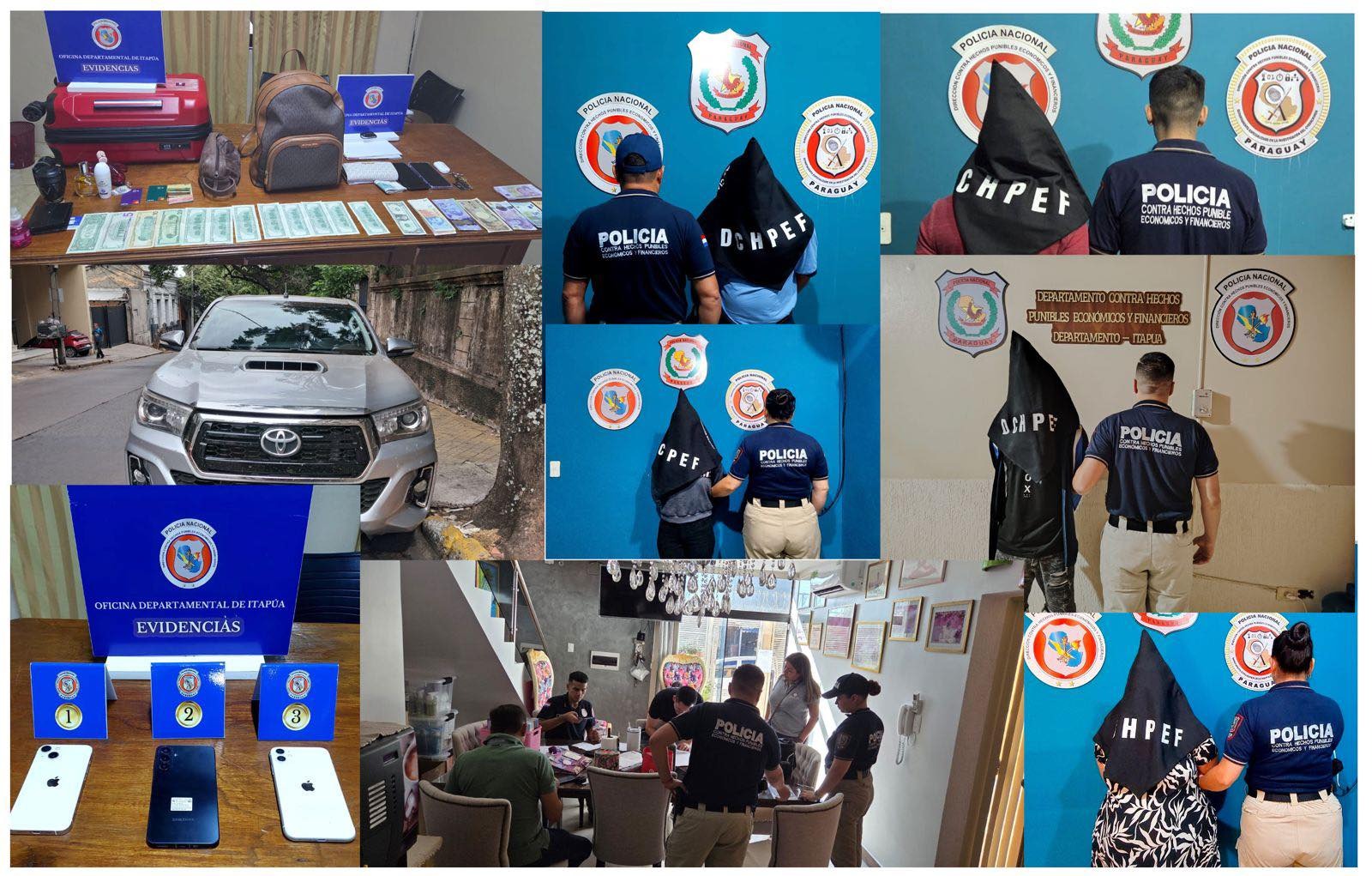 Asimismo, fueron incautadas numerosas evidencias, como teléfonos celulares, tablets, computadoras portátiles, dispositivos de almacenamiento externo y documentación relevante para la causa.