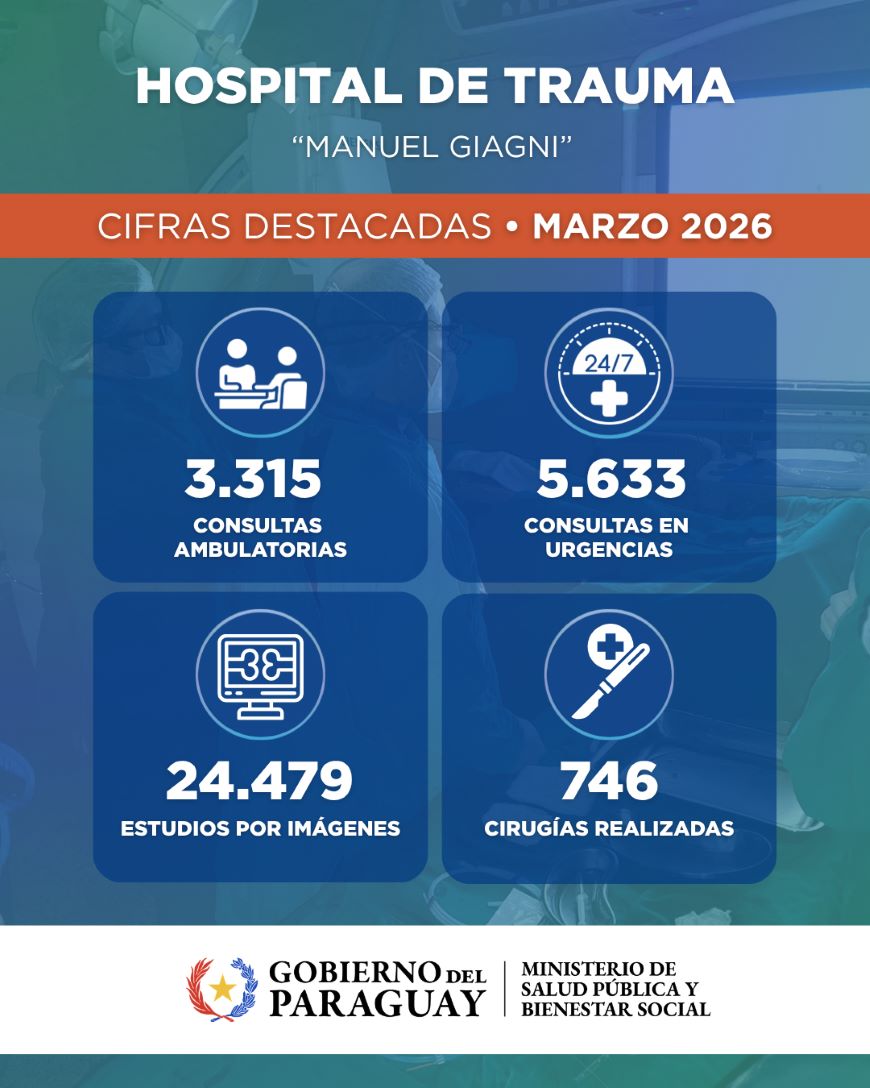 El Hospital de Trauma “Manuel Giagni”, dependiente de hospitales especializados del Ministerio de Salud Pública y Bienestar Social (MSPBS), registró durante el mes de marzo un total de 8.948 consultas, reflejando la alta demanda de atención especializada en lesiones traumáticas y patologías relacionadas.