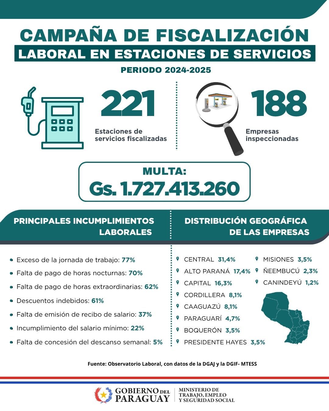 El Ministerio de Trabajo, Empleo y Seguridad Social (MTESS) desplegó una campaña intensiva de fiscalización en estaciones de servicio a nivel país durante el periodo 2024–2025, con un total de 221 establecimientos inspeccionados, correspondientes a 188 empresas.