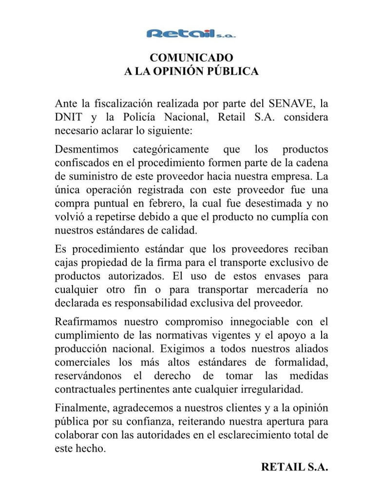 Por su parte, la empresa Retail S.A. emitió un comunicado en el que negó categóricamente que los productos incautados durante un procedimiento de fiscalización realizado por el Servicio Nacional de Calidad y Sanidad Vegetal y de Semillas (SENAVE), la Dirección Nacional de Ingresos Tributarios (DNIT) y la Policía Nacional del Paraguay formen parte de su cadena de suministro.