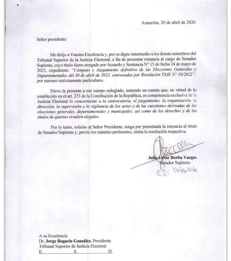 El exministro de Salud Julio Borba, confirmó que no asumirá como senador, según informó mediante una nota remitida al Tribunal Superior de Justicia Electoral (TSJE). Alegó motivos estrictamente particulares.